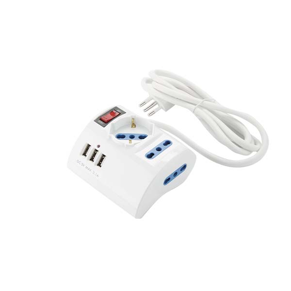 Multipresa da tavolo con 3 porte USB grazie alla quale è possibile collegare fino a 3 dispositivi elettronici. 2 prese 10\16A bipasso, 1 presa bipasso Schuko con protezione di sovraccarico e con interruttore ON\OFF e 3 connessioni USB. Disponibile nelle colorazioni di nero o bianco e dotata di cavo di alimentazione di 1,5 metri di lunghezza.